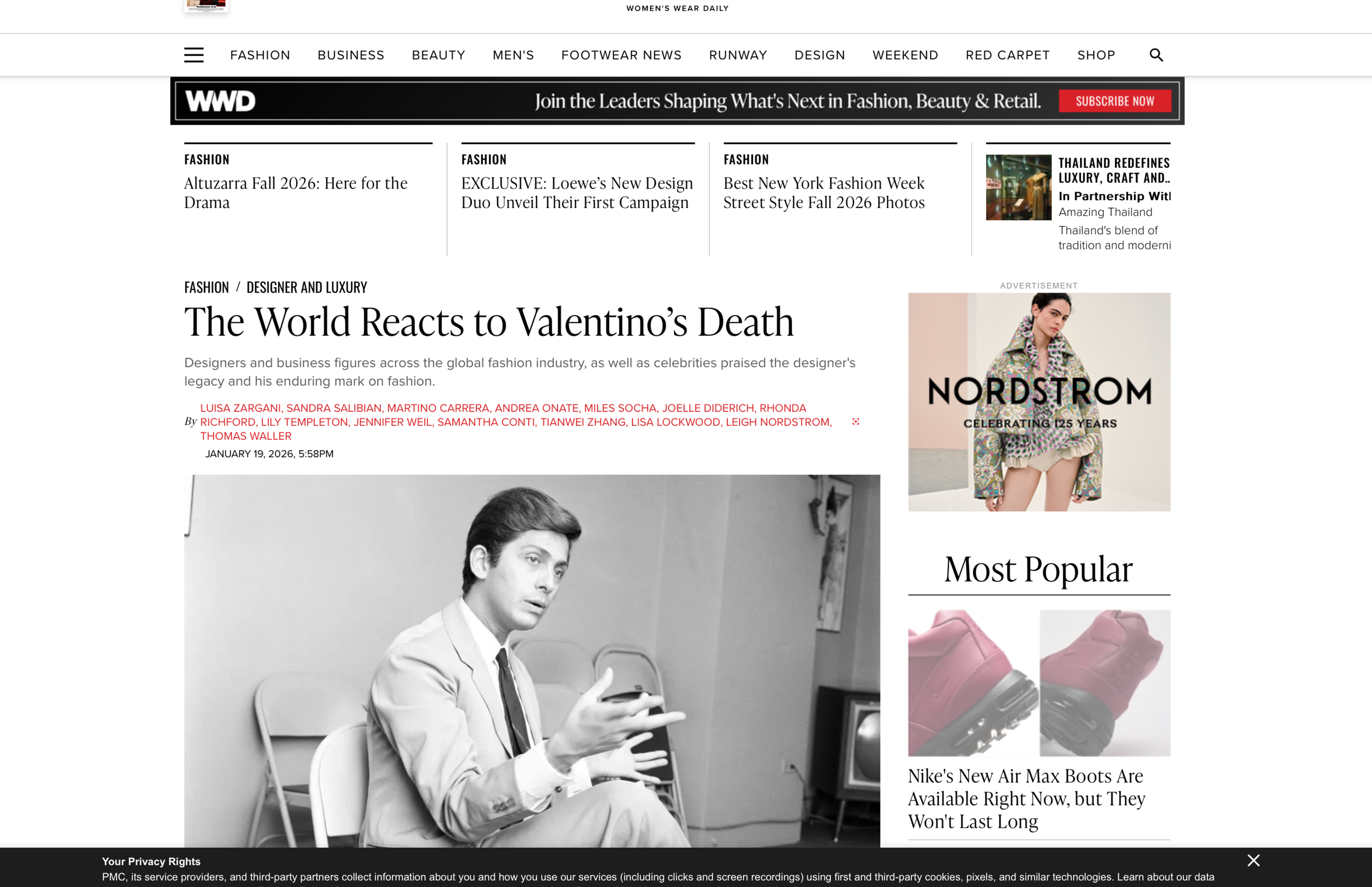 Comments to WWD on the death of Valentino